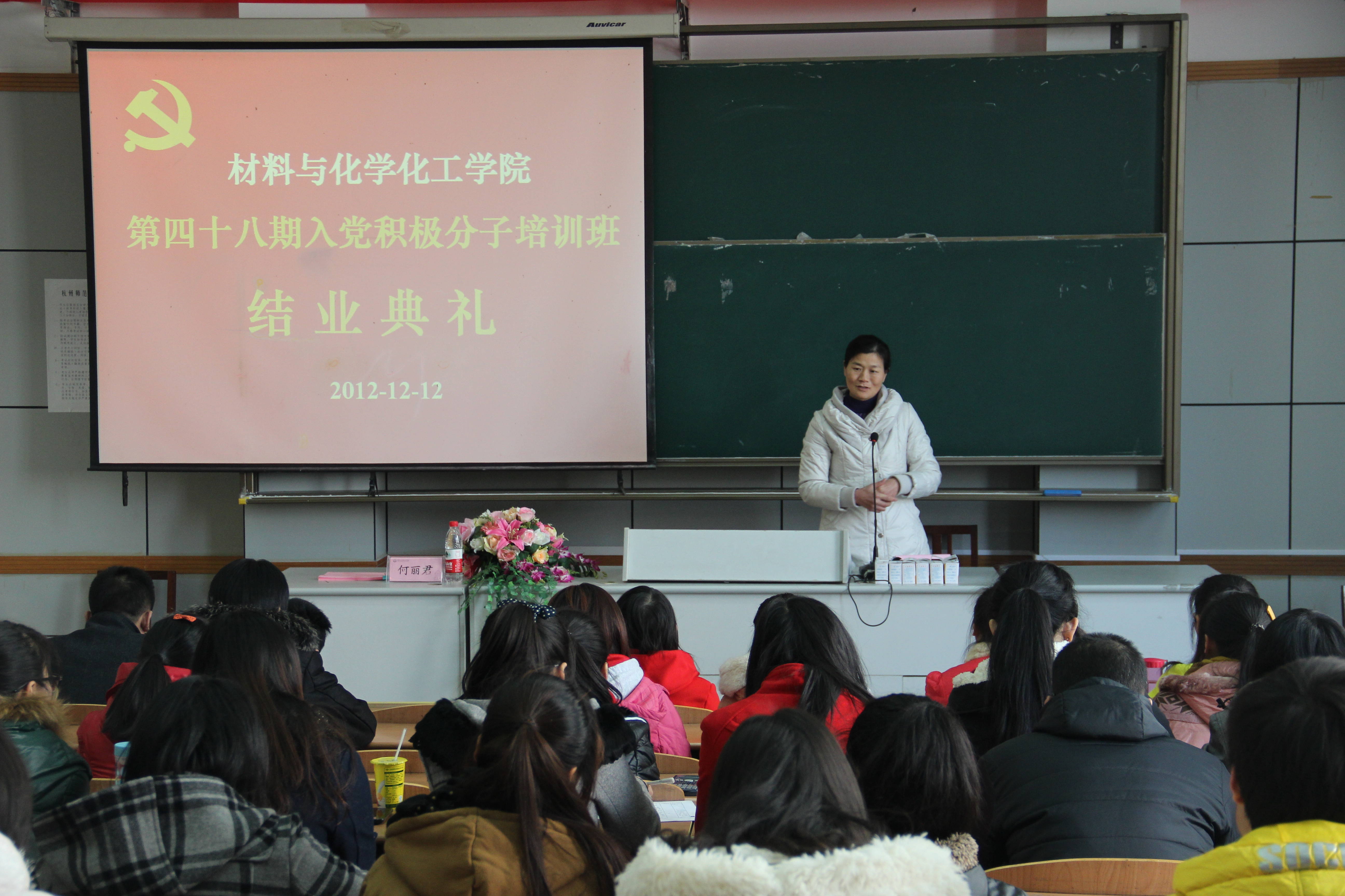 第四十八期入党积极分子培训班结业典礼在教学B楼102隆重举行。学院党总支副书记何丽君老师出席会议并讲话。会议由培训班班主任管庆江老师主持。